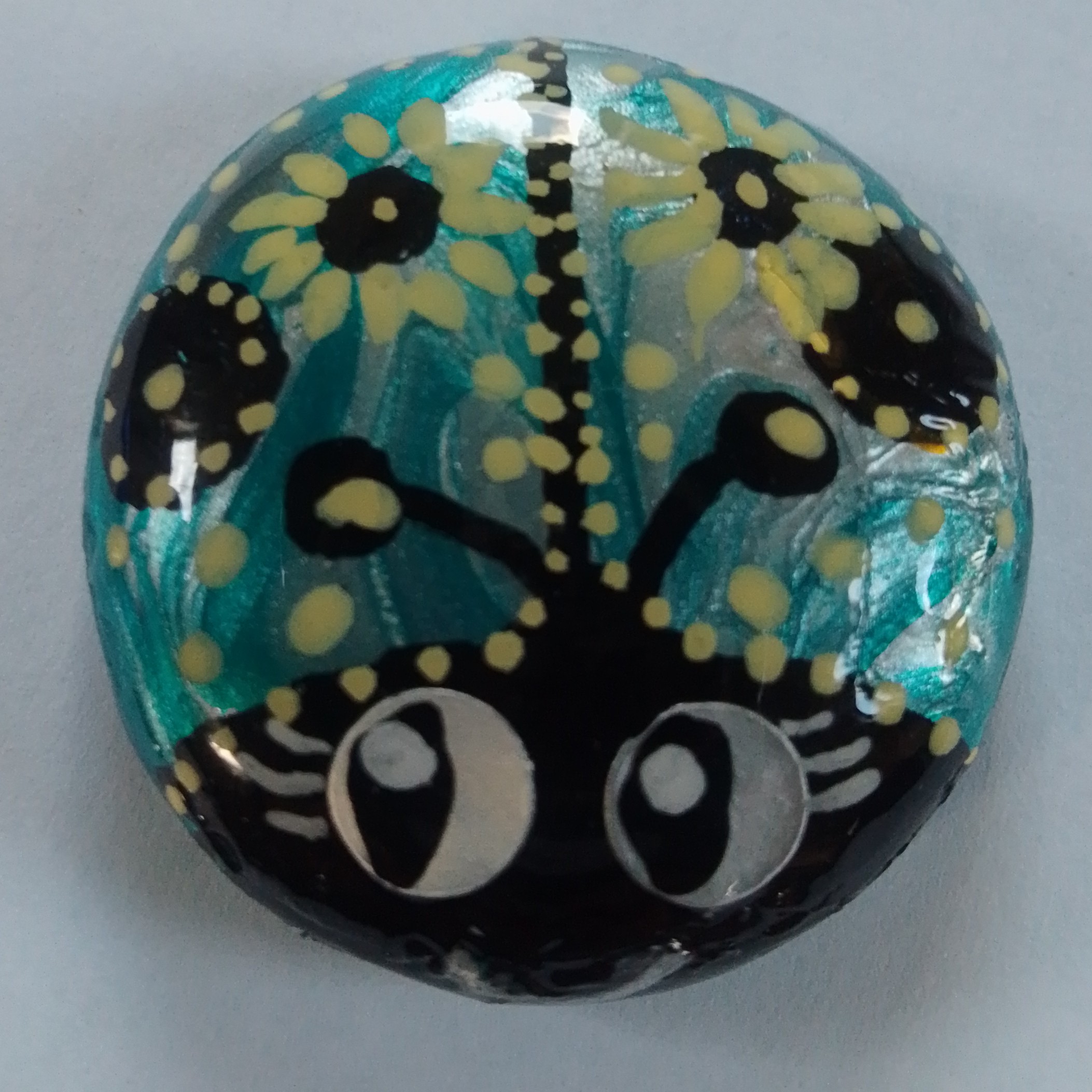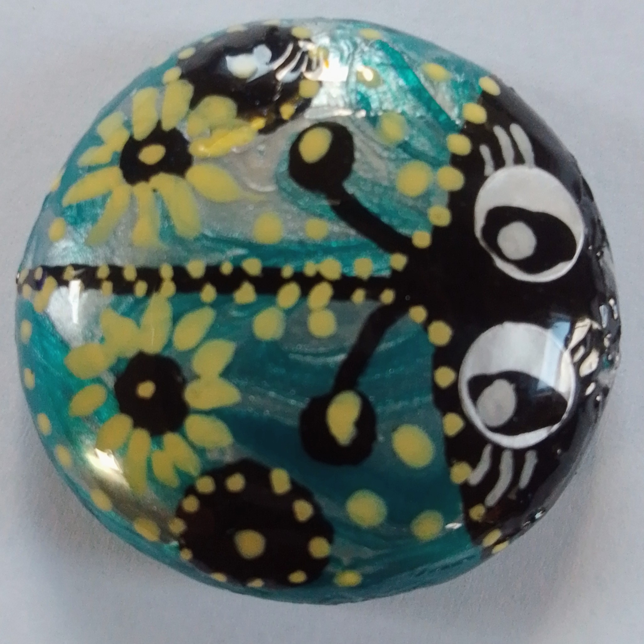 I have designed and painted them on glass stones in acrylics and sealed them with resin for protection. Some have gold leaf or copper under the painting. Each bug is completely different so I have listed them all separately. The little bugs measure approximately 3.5cm across.