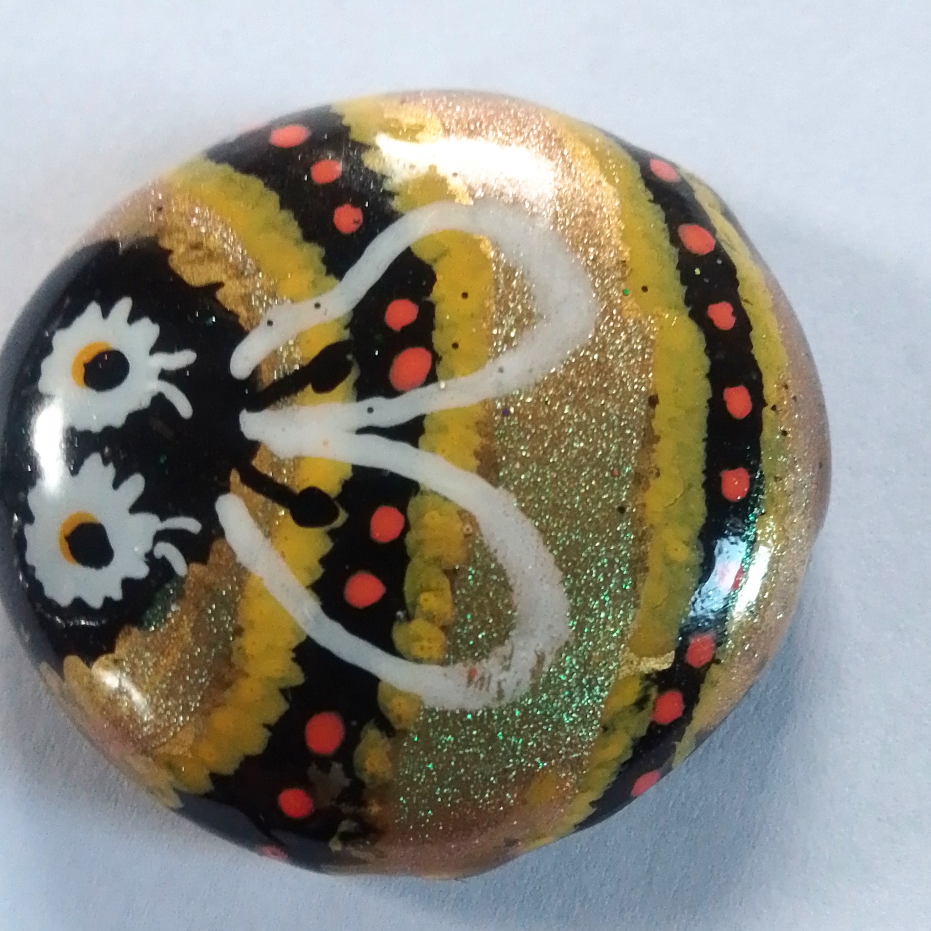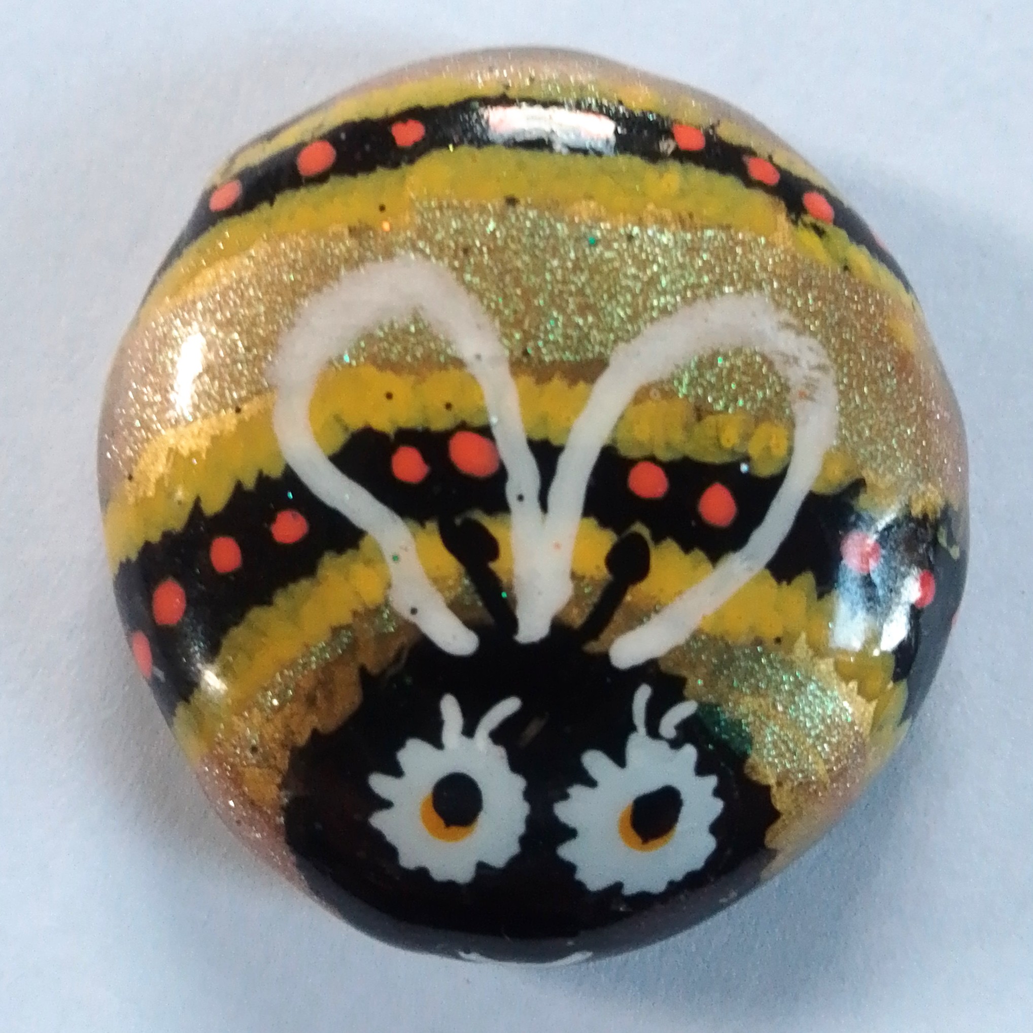 I have designed and painted them on glass stones in acrylics and sealed them with resin for protection. Some have gold leaf or copper under the painting. Each bug is completely different so I have listed them all separately. The little bugs measure approximately 3.5cm across.