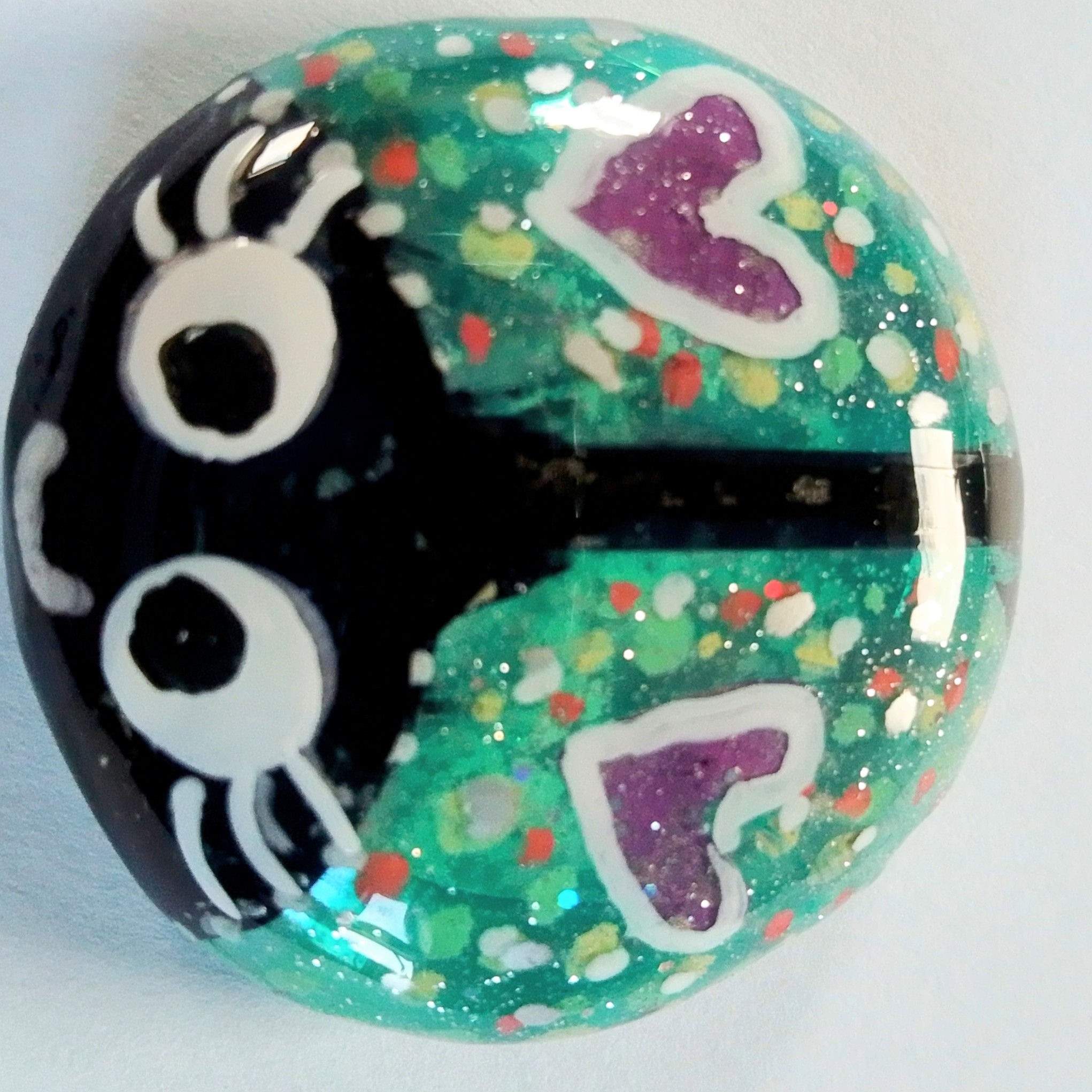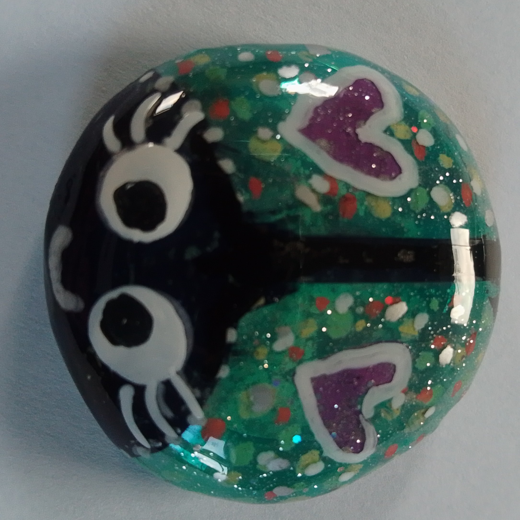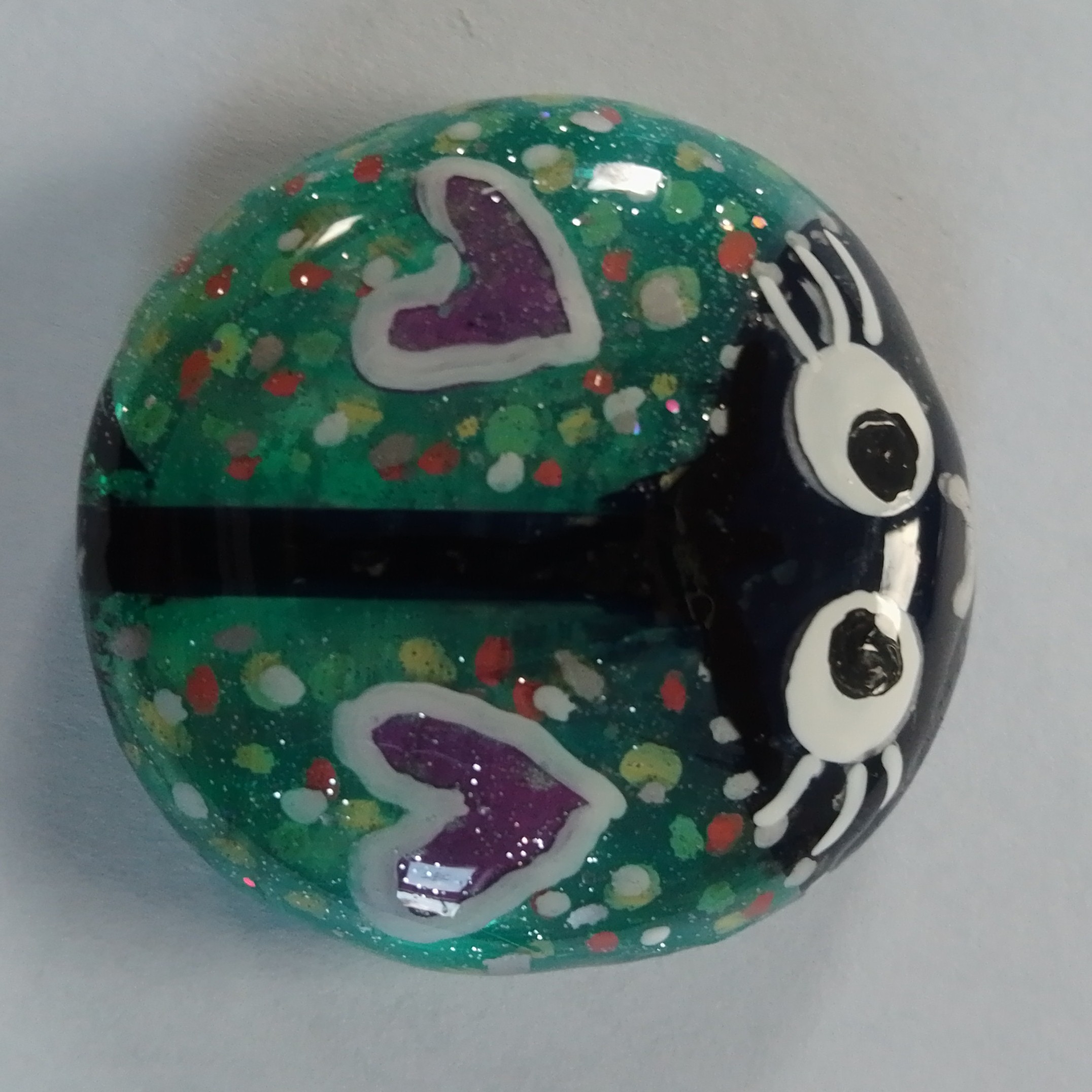 I have designed and painted them on glass stones in acrylics and sealed them with resin for protection. Some have gold leaf or copper under the painting. Each bug is completely different so I have listed them all separately. The little bugs measure approximately 3.5cm across.