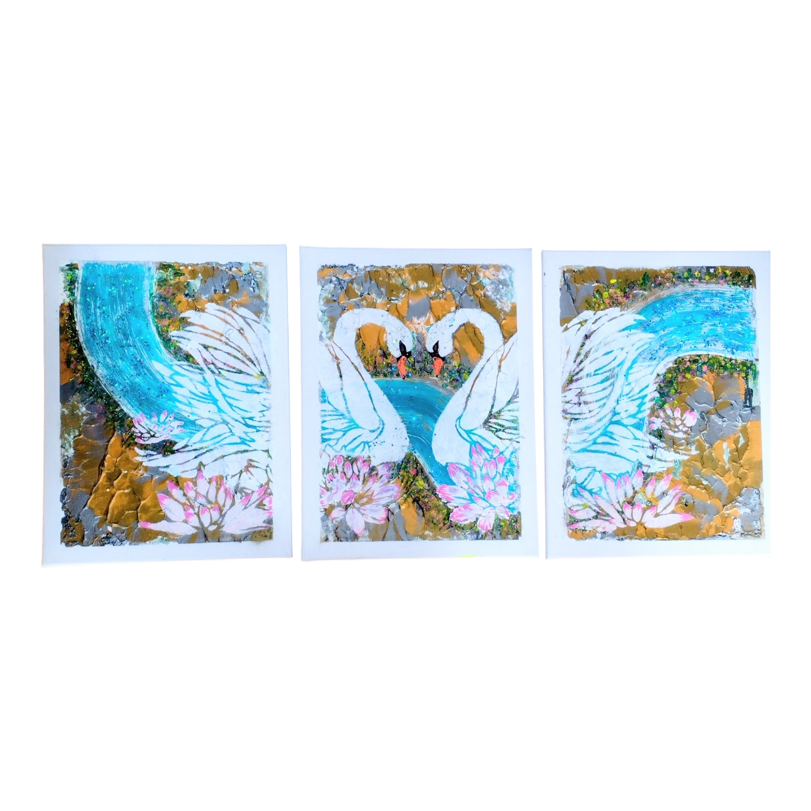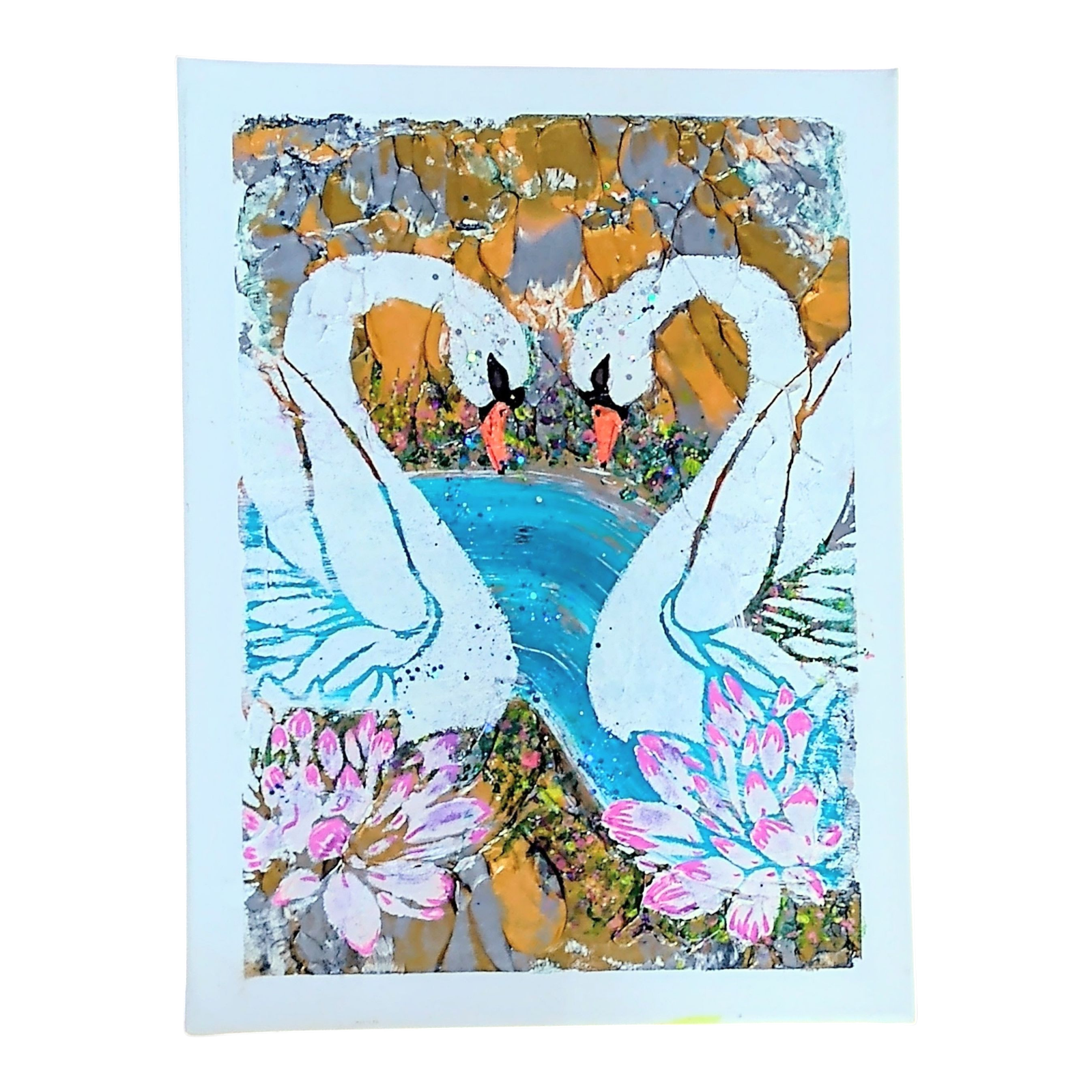An abstract art painting of two beautiful swans forming a heart shape as they gaze at each other with the admiration and everlasting love, swans pair for life and are a most beautiful reflection of everlasting love, they are set against a scenic background of glittering blue river and riverbank entitled "Echos of Eternity"