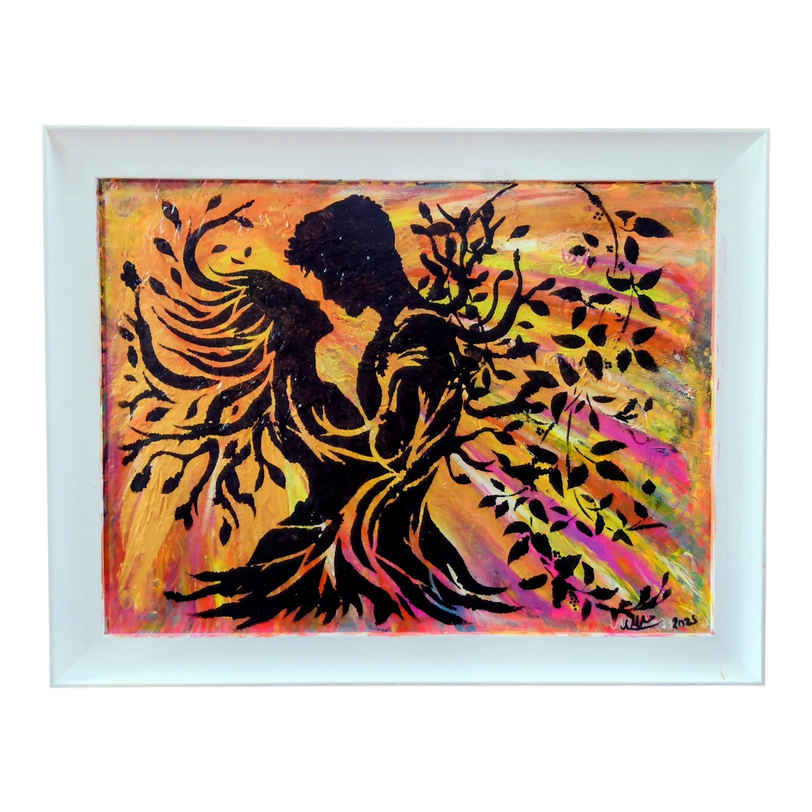 An abstract art painting of man and woman entwined as a tree entitled "Eternal Flame" This is an acrylic painting on A3 board and framed in a white painted wooden frame, total size framed is 45.5 CMS wide by 35.5 CMS tall