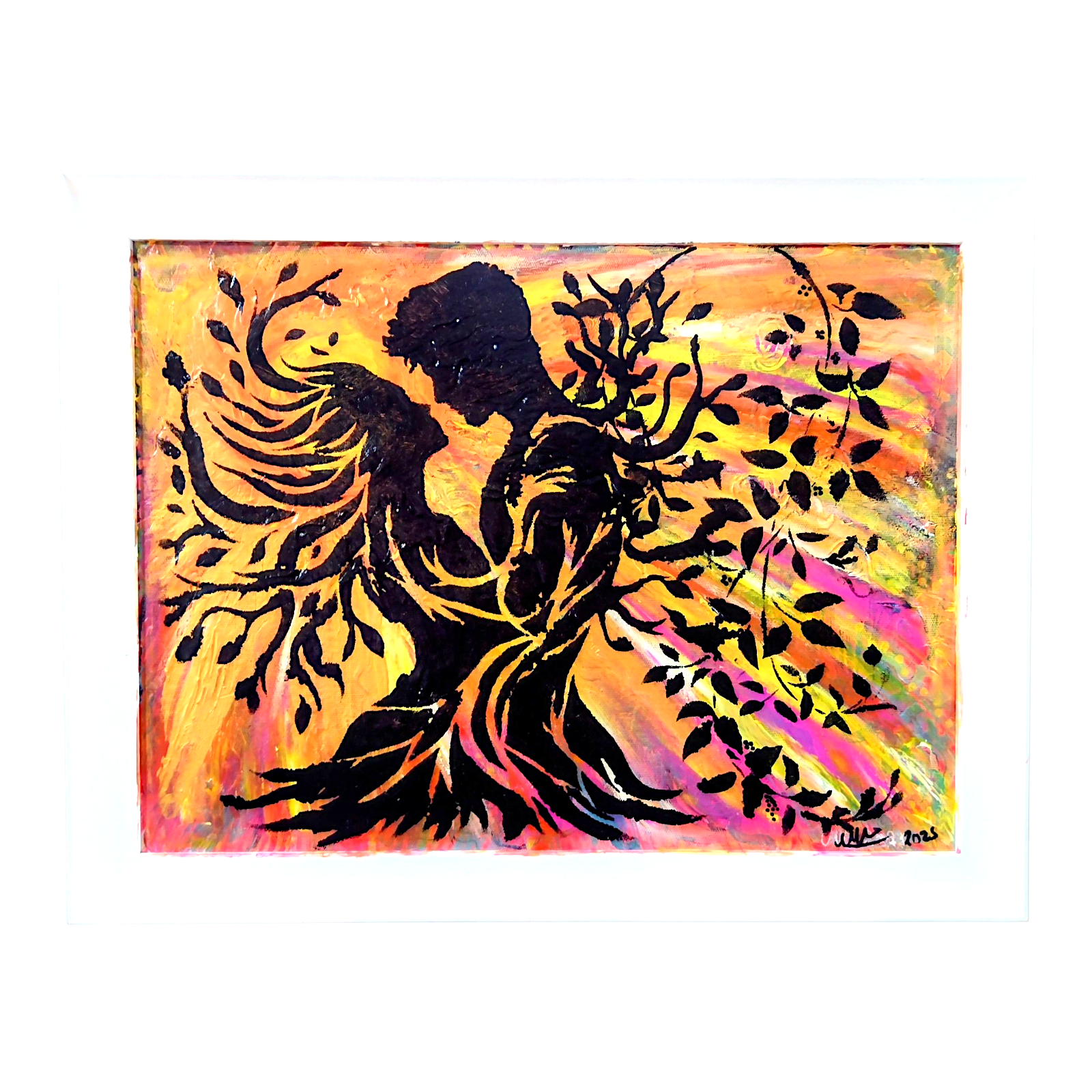 An original amateur abstract art painting of man and woman entwined as a tree entitled "Eternal Flame"