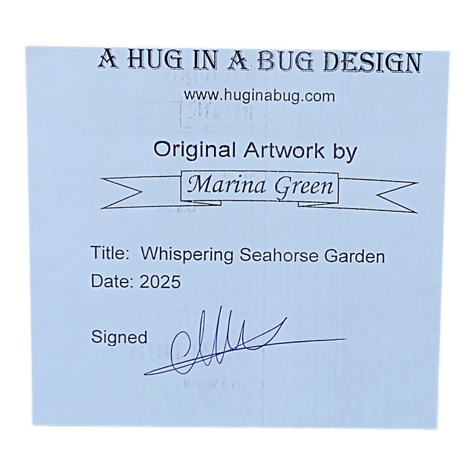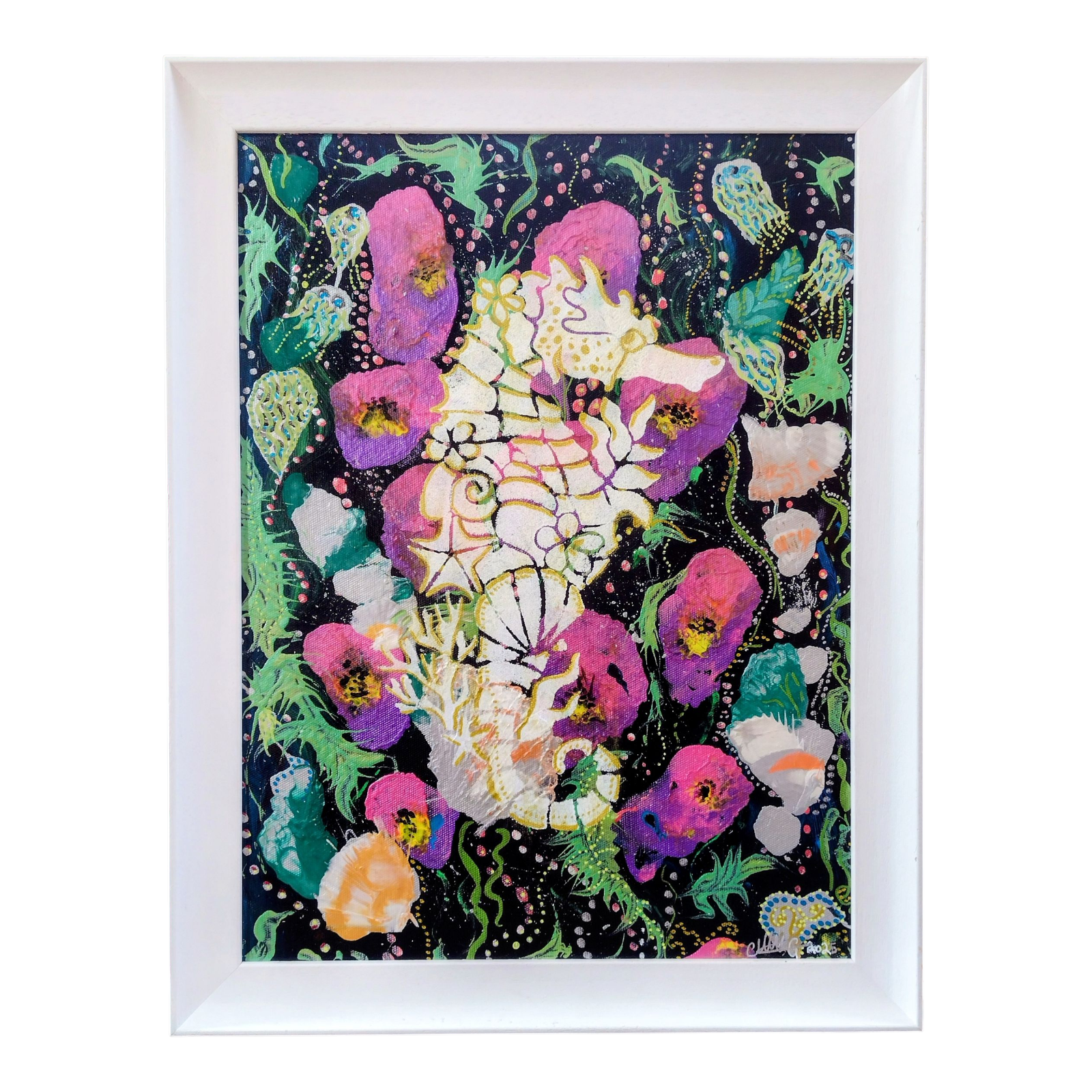 An abstract art painting of a seahorse floating in the waters of an enchanted underwater garden entitled "Whispering Seahorse Garden" This is an acrylic painting on A3 board and framed in a white painted wooden frame, total size framed is 35.5 CMS wide by 45.5 CMS tall.