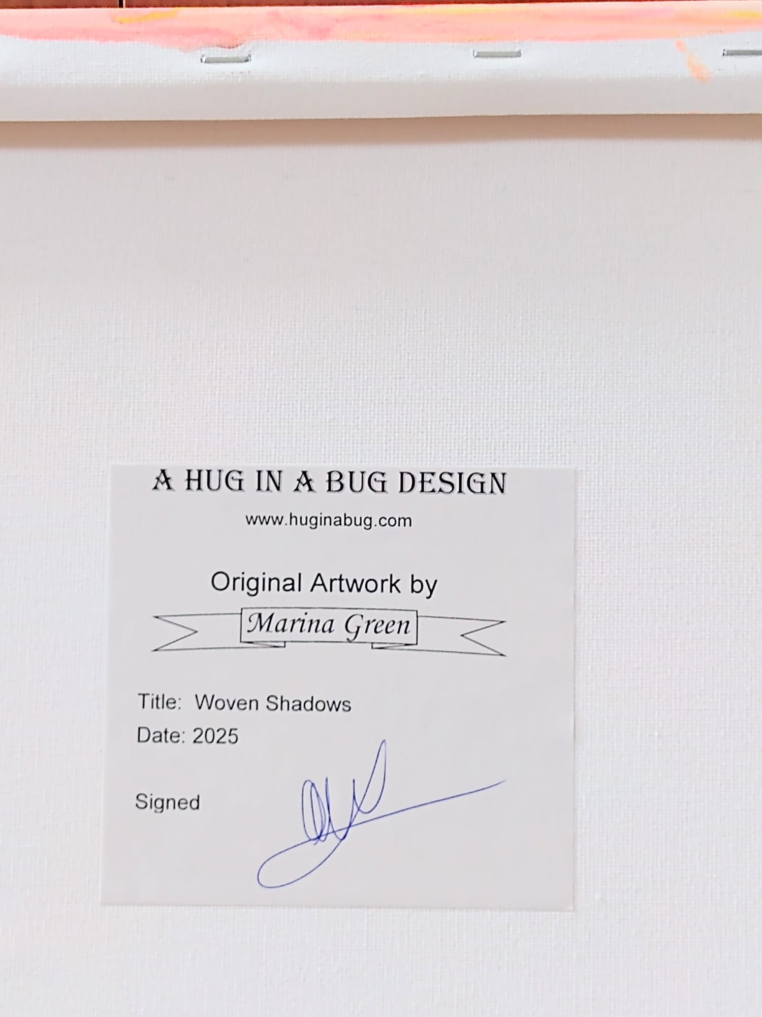 An abstract art painting symbolising the view through shadowed leaves into a bright hazy sunny day, relaxing, listening to the breeze and taking in the peace of the outdoors, entitled "Woven Shadows "This is an acrylic painting on canvas measuring 40 cms wide by 30 cms tall.