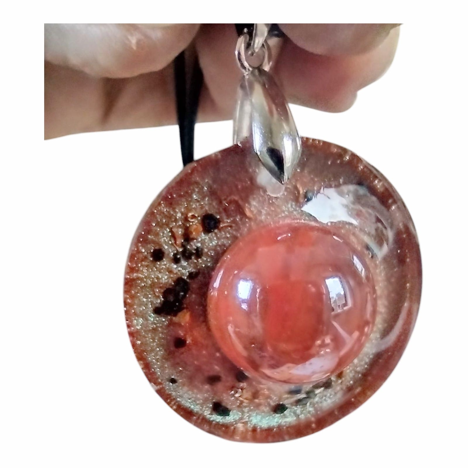 This particular pendant is set with a full marble representing Mars and surrounded by a beautiful sparkling iridescent border. Set within the sparking border are pieces of copper and supercharged magnetite representing cosmic rocks to provide great EMF protection and a standout look that will draw attention..