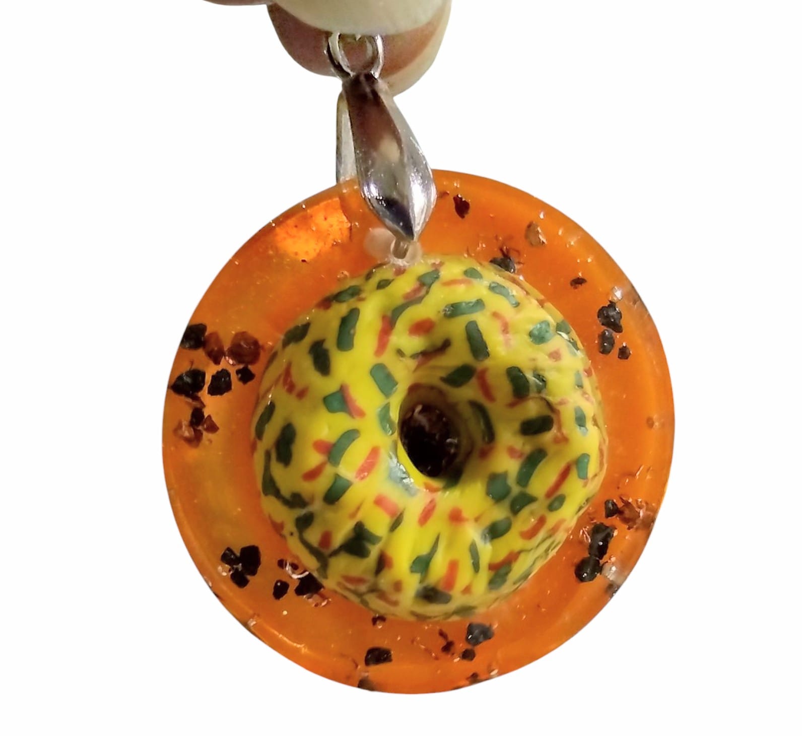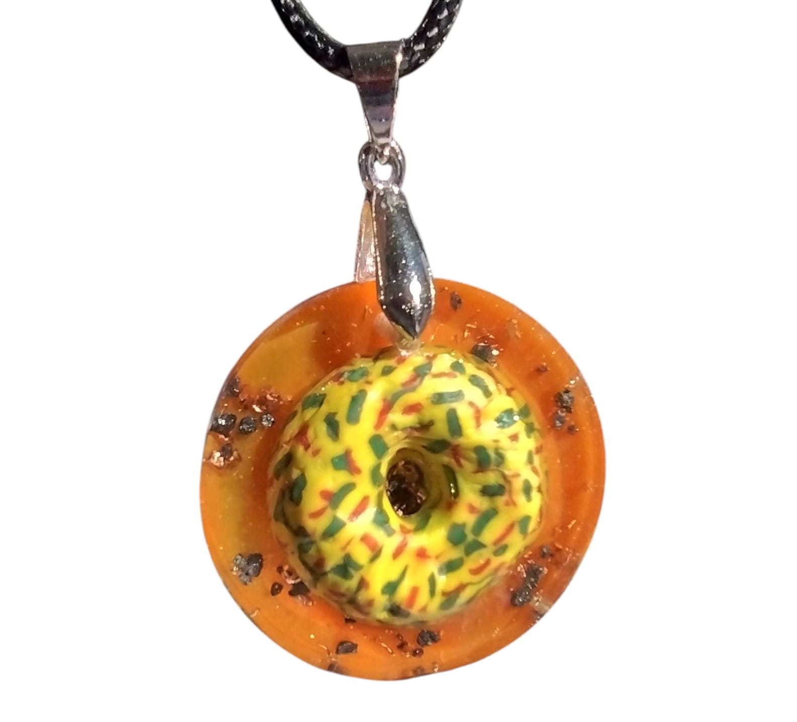 This particular pendant is set with a hand painted glass bead representing the sun and surrounded by a beautiful sparkling yellow border. Set within the sparking border are pieces of copper and supercharged magnetite representing cosmic rocks to provide great EMF protection and a standout look that will draw attention..