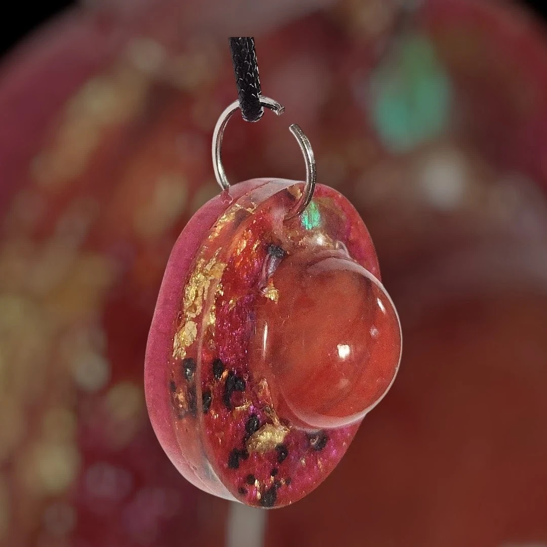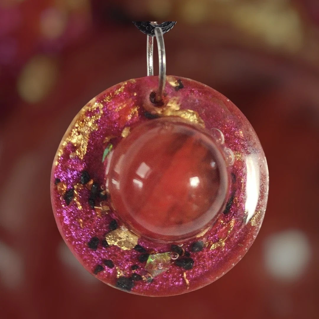 This particular pendant is set with a full marble representing Venus and surrounded by a beautiful sparkling iridescent border. Set within the sparking border are pieces of copper and supercharged magnetite representing cosmic rocks to provide great EMF protection and a standout look that will draw attention..