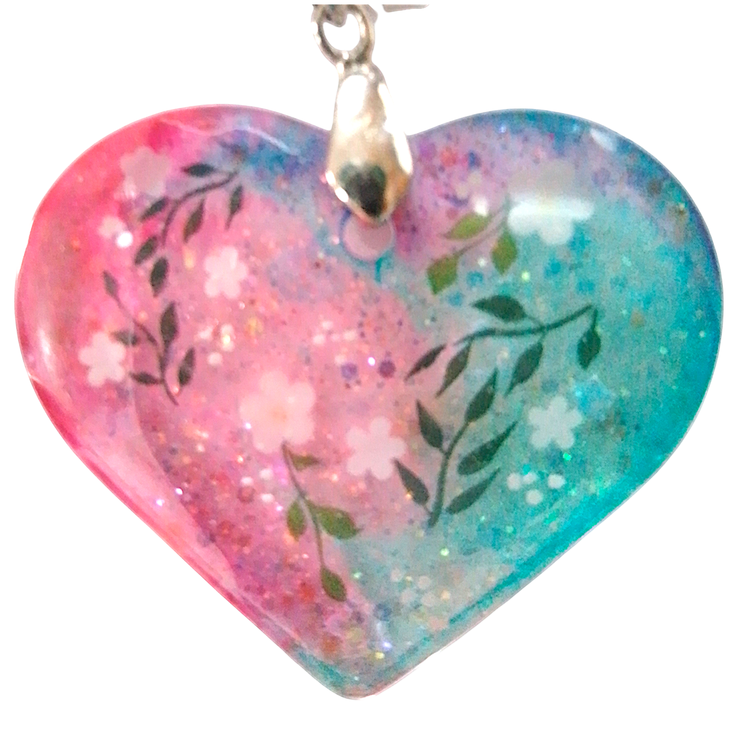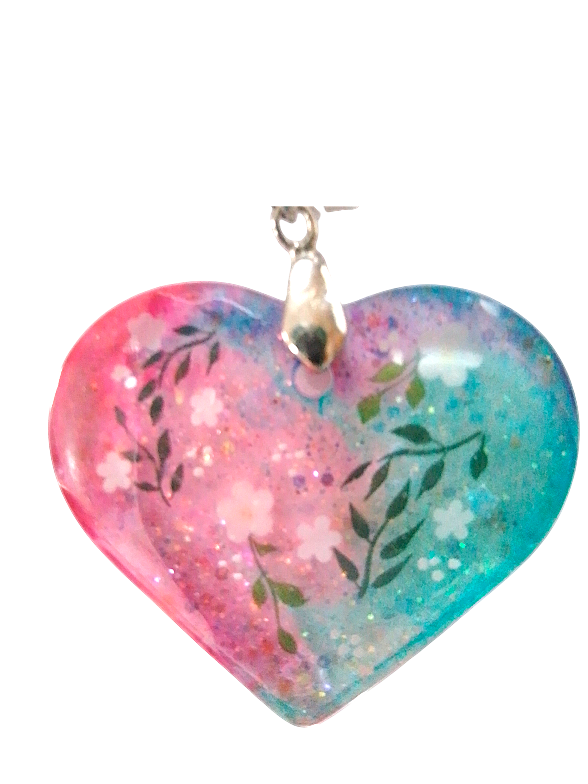Reiki charged handmade pendant heart shaped floral glitter pink and blue