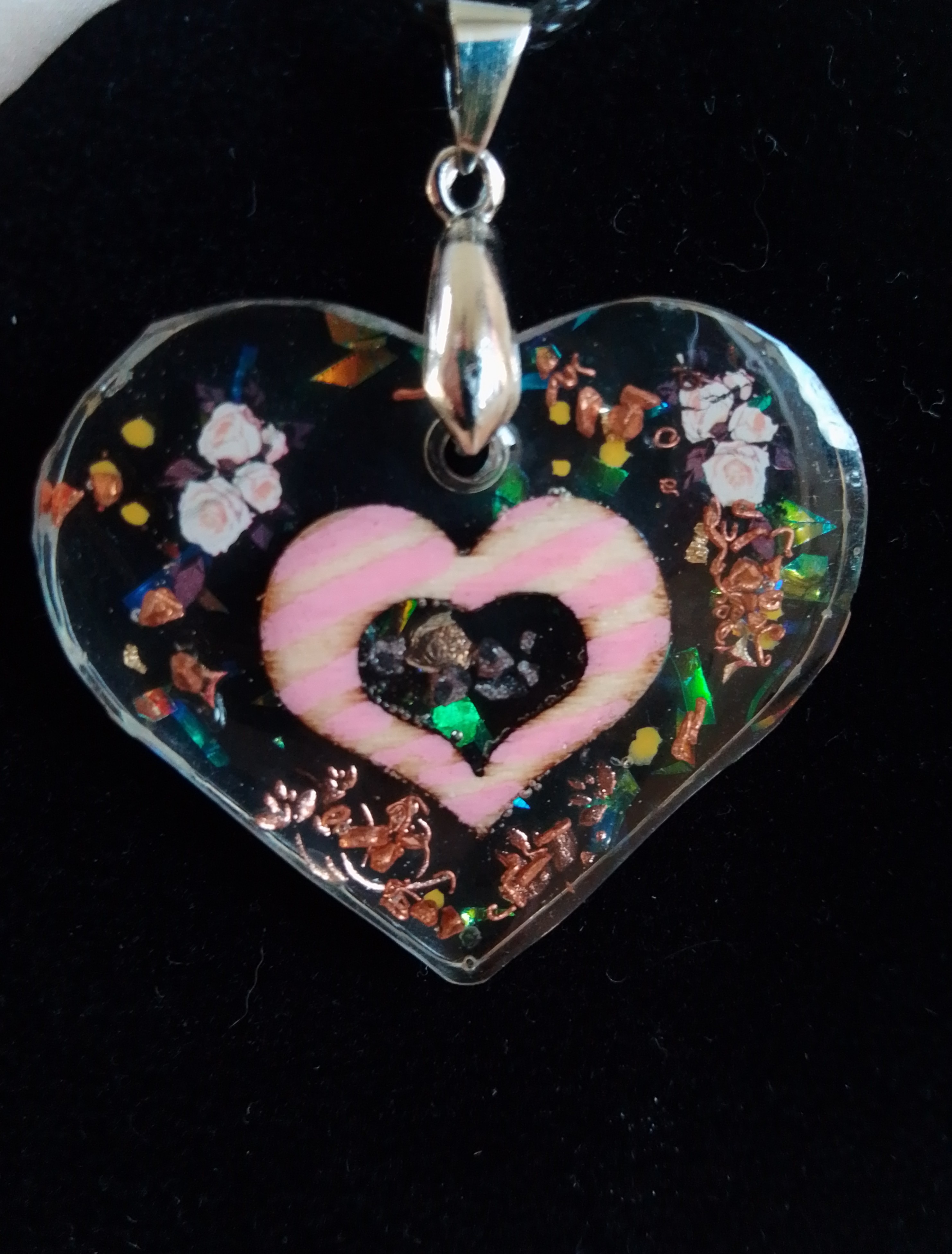Each one is unique and completely different, they contain pieces of copper and magnetite for added protection including EMF protection. This pendant measures 3cm x 3.7cm as a heart not including hoop.