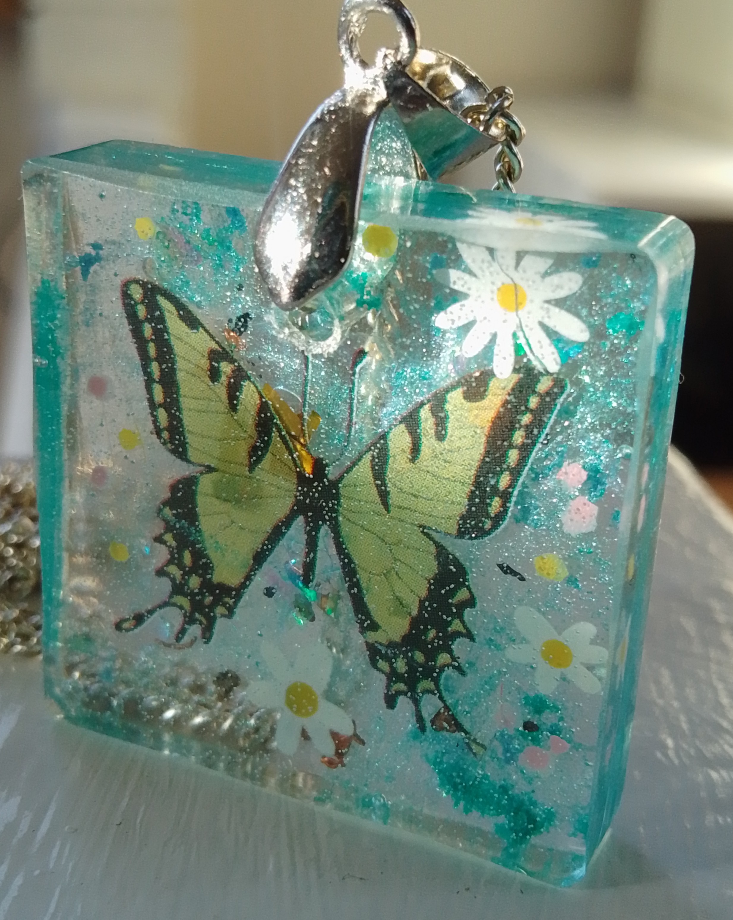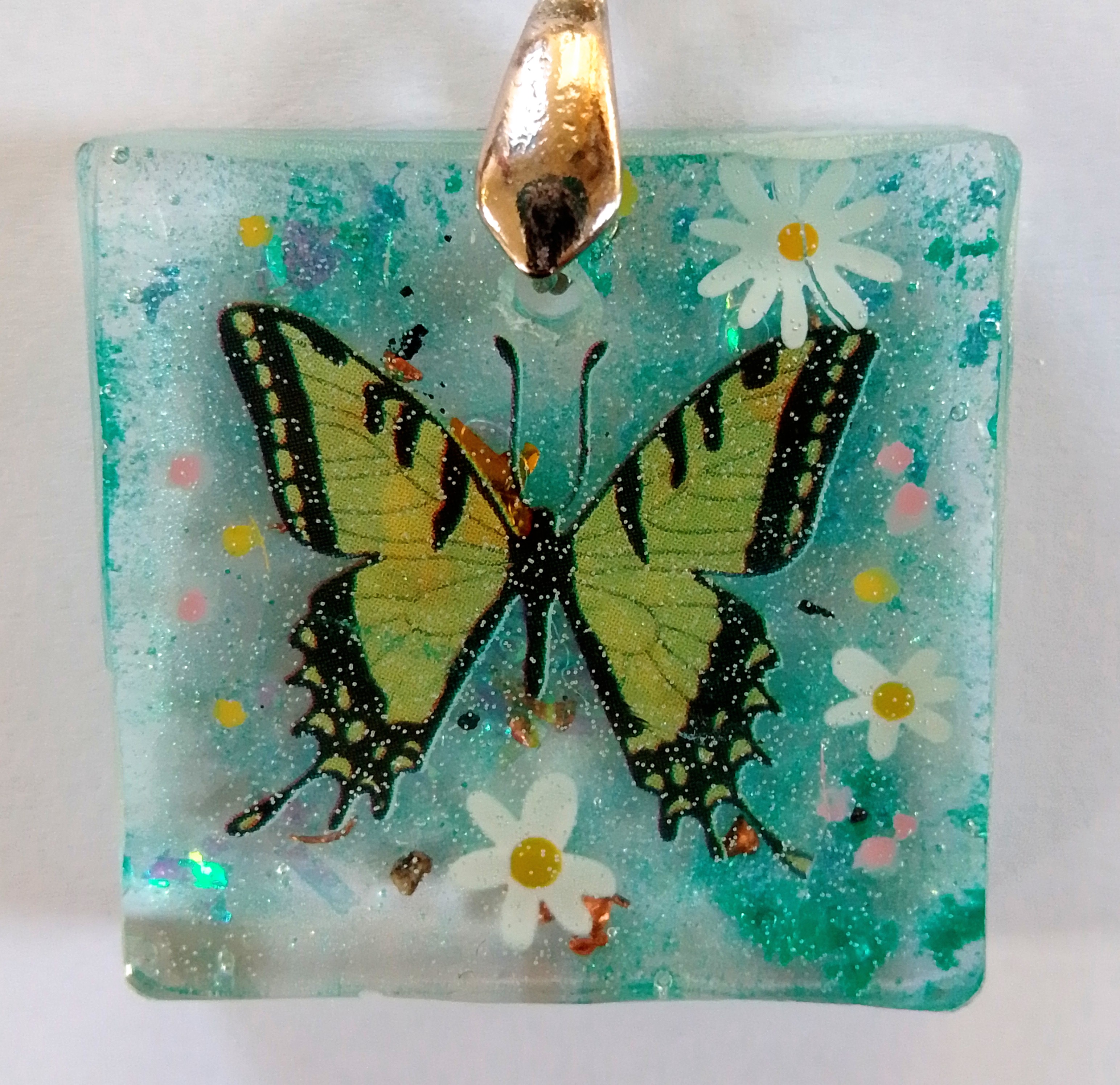 Handmade EMF protection pendant with butterfly, floral and glitter details (Butterfly not real)