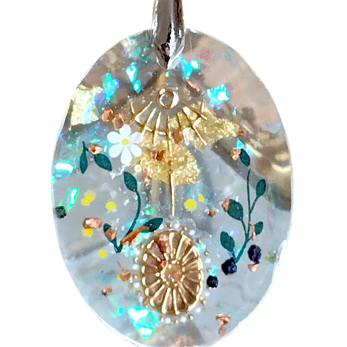 A beautiful pendant with pretty hand painted and applied designs.